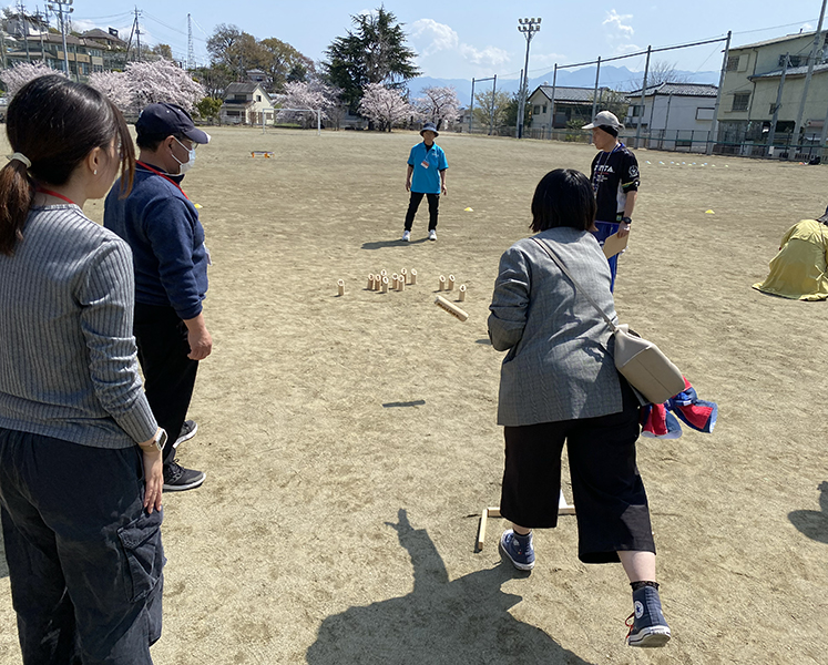 毎週金曜の15:00〜15:15の休憩時間に、オズプリンティング遊悠館のグラウンドを借りて、モルックで息抜きをしています。